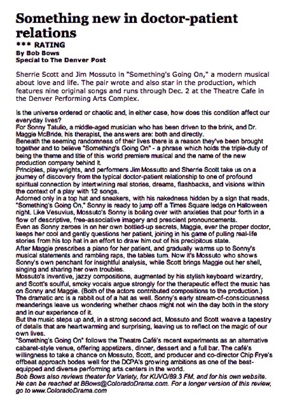 It’s Halloween night in New York City. Sonny Tatulio, a musician and storyteller, has been driven to the edge of a rooftop in Times Square, wearing nothing but a top hat, sneakers and holding a sign reading, Something’s Going On. Rescued by police, he is brought to the emergency psyche ward, where Dr. Maggie McBride, his appointed psychiatrist, has 72 hours to determine his sanity before she loses her own. Once an accomplished singer, Maggie hasn’t sung in over twenty years. But after discovering that Sonny is a musician, she has a piano brought in from down the hall. And through a clash of realities, two totally different view of the world and nine original songs, the mystery unfolds.